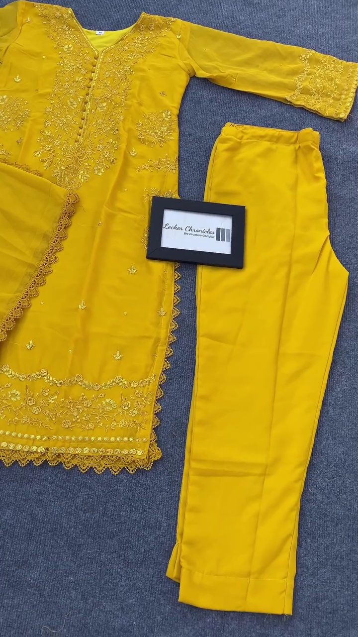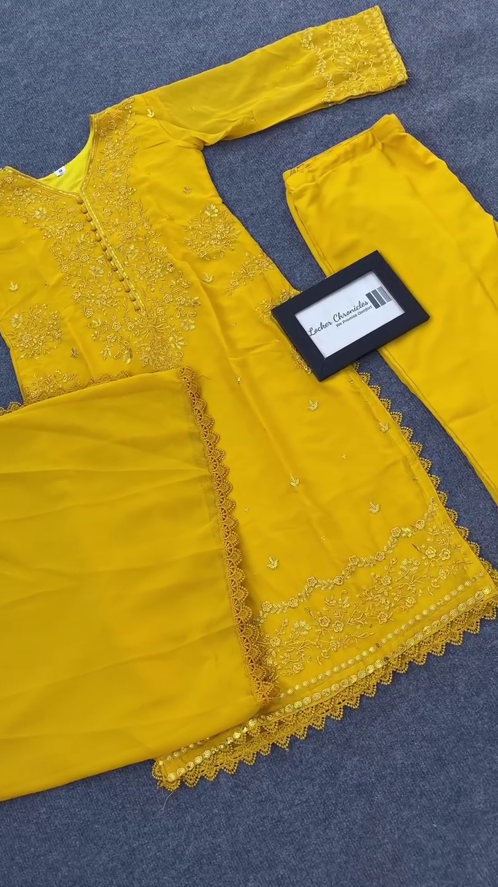 This vibrant yellow suit set is a perfect festive choice. The kurti features intricate embroidery along the neckline and hem, adding richness and detail to the bright base. The matching trousers complete the coordinated look, making it suitable for traditional events or celebrations.