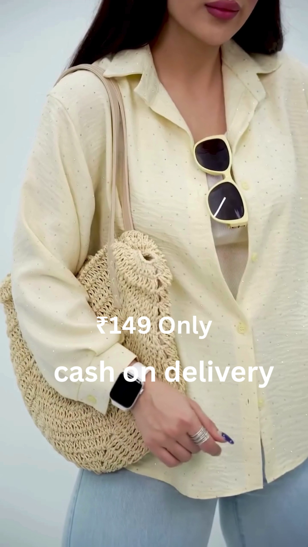 Styled with minimal accessories and a woven handbag, the outfit reflects effortless sophistication. The sparkle accents catch the light beautifully, making it perfect for brunches, casual meetings, or evening outings.