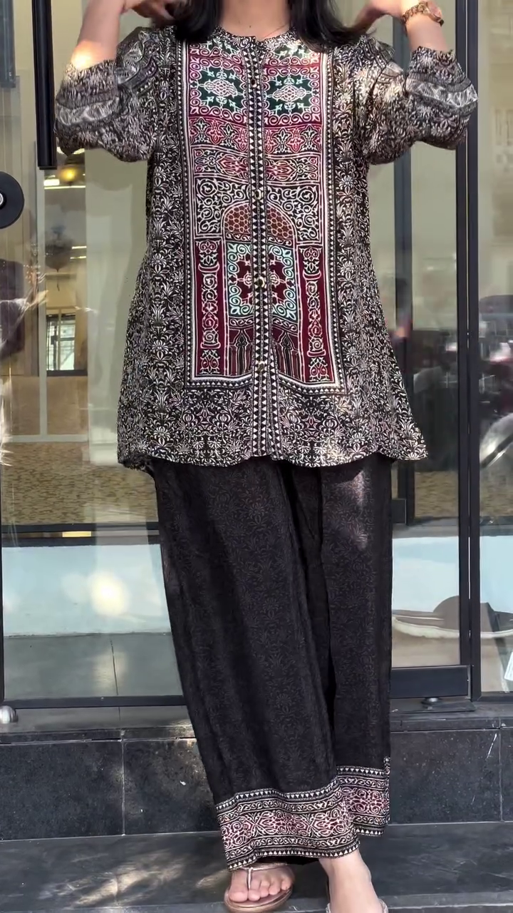 Upgrade your daily ethnic style with this beautifully designed printed co-ord set that blends tradition with comfort. Featuring a dark base enhanced with intricate maroon and green geometric motifs, this outfit delivers a classy yet versatile look suitable for casual outings, office wear, or relaxed festive gatherings. The kurti showcases a detailed neckline pattern with decorative tassel accents that add a subtle traditional touch while keeping the design contemporary.
