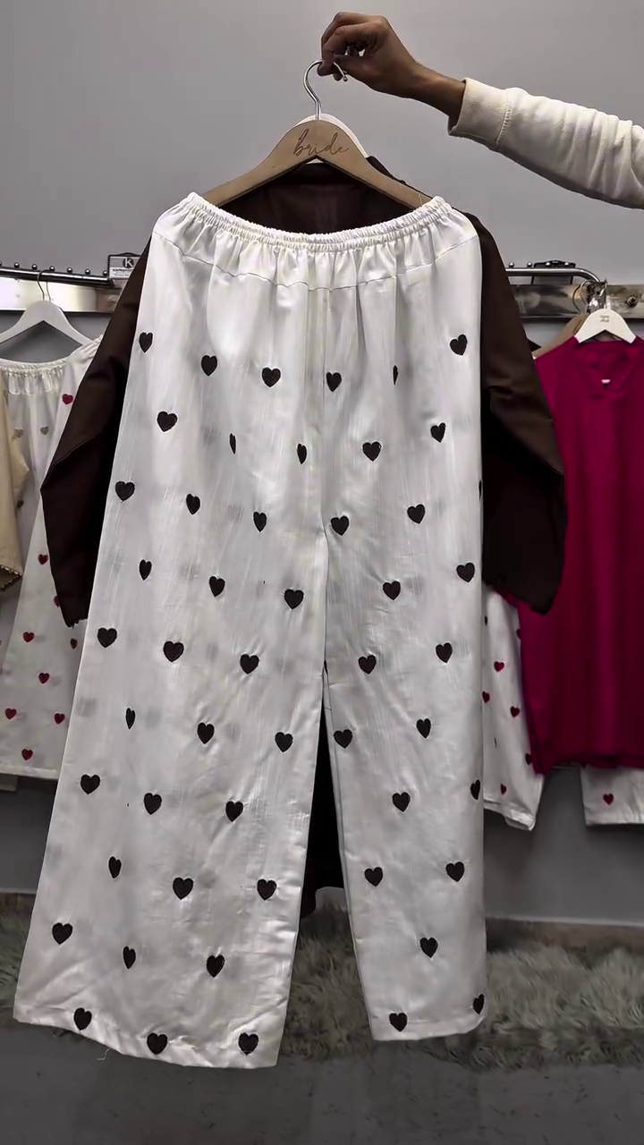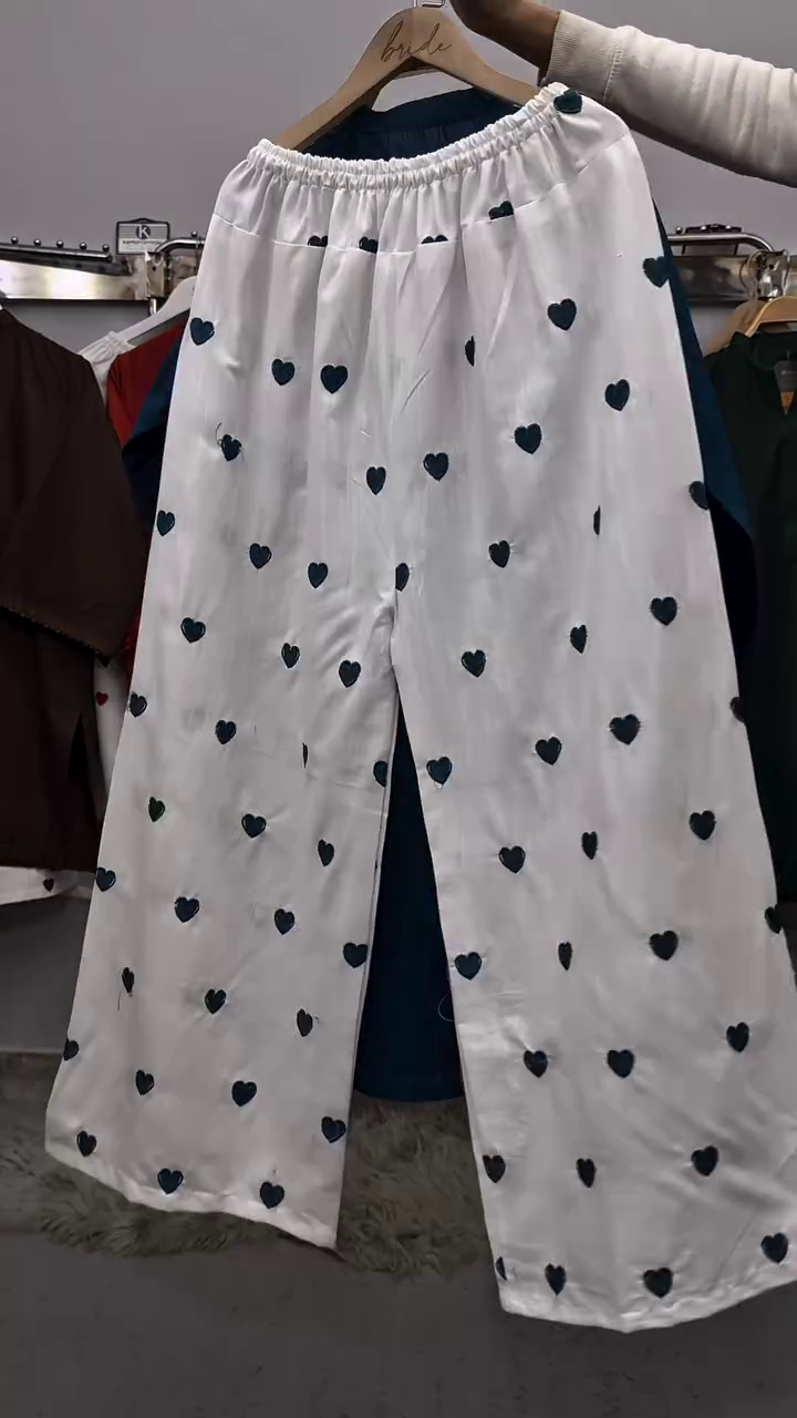 These white palazzo pants feature scattered heart prints that add a fun and charming detail. The wide-leg design ensures comfort and breathability, making them ideal for casual wear.